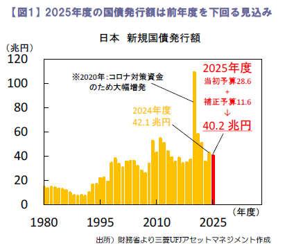 債券市場では、巨額の経済対策を巡って財政悪化が懸念されるなか、政府は11兆円超の新規国債を追加発行する方針を表明。高市首相は財源について、「当初予算と補正予算を合わせた補正後の国債発行額は昨年度を下回る見込みで、財政の持続可能性にも十分配慮」と強調。責任ある積極財政を掲げるなか、一定の配慮がうかがえるものの(図1)、市場の警戒感は根強いようです。