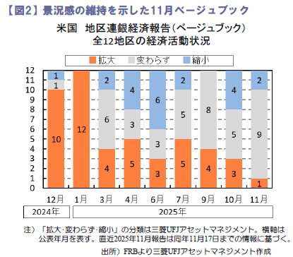 12月FOMCでの討議のベースとなる、ベージュブック(地区連銀経済報告)が26日発表されました。経済活動が「拡大」は1地区、「縮小」は2地区、「変わらず」が9地区と、拡大・縮小共に減少し、変わらずが大多数を占めるなど、足元での景況感の維持が示されました。雇用の緩やかな減少と物価高止まり基調の継続が確認されたため、政策金利見通しを一方に傾ける結果とはなりませんでした。報告書では、トランプ関税によるコスト増圧力の広がりが示されていますが、上述のように、主要な米企業はそれに抗し利益を高めている状況にあります。