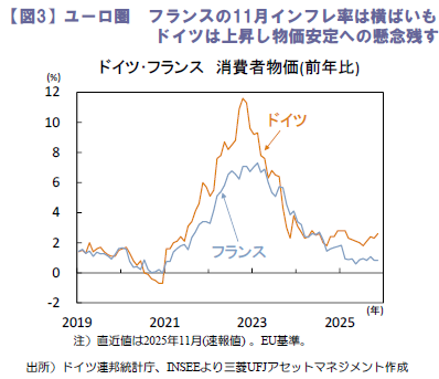 28日に公表されたフランスの11月消費者物価(EU基準、速報値)は前年比+0.8%と市場の小幅な加速予想に反して横ばい。一方、ドイツの11月消費者物価は同+2.6%と市場予想以上に伸びが加速し、物価安定への懸念を残す結果となりました(図3)。今週2日にはユーロ圏の11月消費者物価(速報値)が公表され、ECBによる様子見姿勢維持に支援的な内容となるか注目されます。(吉永)