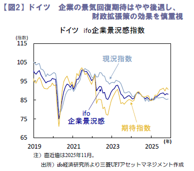 また、24日に公表されたドイツの11月ifo企業景況感指数は88.1と小幅に悪化しました(図2)。現況指数は85.6と市場予想(85.5)をわずかに上回り、10月から改善した一方、期待指数は90.6と市場予想(91.4)を下回りました。公表元は、企業は現状をやや前向きに捉えているものの、目先の景気回復への期待はほとんど持っていないと指摘し、政府の財政拡張策による景気押し上げ効果に対する企業の疑念も示唆しました。2025・26年度予算に伴う支出拡大は、プロジェクト承認や各種事務手続きなどを経て具現化するまでにタイムラグが生じるため、財政拡張による景気押し上げはより緩やかなペースに留まる可能性も意識され、ドイツ景気の弱さは当面続きそうです。