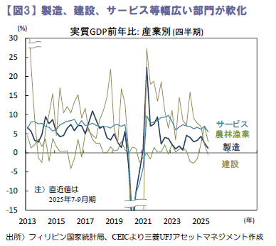 外需では総輸出が同+7.0%(同+4.7%)へ加速。半導体にけん引され財輸出が同+11.6%(同+14.0%)拡大しました。総輸入は同+2.6%(同+3.5%)へ鈍化しました。生産側では建設業が落ち込み、製造業やサービス部門が鈍化しました(図3)。農林漁業は同+2.8%(同+7.0%)へ鈍化。台風被害の影響です。鉱業は同+4.4%(同▲1.3%)へ反発した一方、製造業は同+1.2%(同+2.5%)へ鈍化。財輸出が伸びたものの、先行きに慎重な企業は増産せずに在庫を取り崩した模様です。建設業は同▲0.5%(同+2.1%)へ反落。公的建設が落ち込みました。サービス部門は同+5.5%(同+7.0%)へ鈍化。運輸・倉庫や情報・通信などが減速しました。