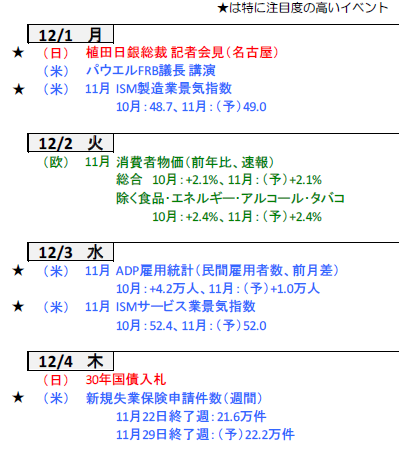 日銀が重視する基調的なインフレ率の高止まりも見られるなか、植田総裁は、円安が基調的な物価上昇率に波及する可能性に言及するなど、足元加速する円安に警戒感を示しています。複数の日銀高官からも利上げに前向きな発言が相次ぐなか、ハト派とされる野口審議委員は11月27日の講演で「時を置いて小刻みな利上げが現実的、政策調整は慎重に行うべき」と言及、慎重姿勢を示したものの、政策調整(利上げ)が必要との立場は維持しました。今週1日の植田総裁の挨拶で次回12月会合での利上げへ地ならしがみられるか注目が集まります。
