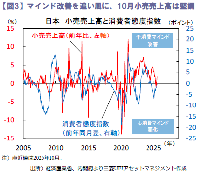11月28日公表の10月小売売上高は、前年比+1.7%と市場予想を上回り堅調、暖房器具など家電販売が増加しました。一方、同日公表の11月東京都区部消費者物価(生鮮食品除く総合)が前年比+2.8%と高止まりするなか、飲食料品の販売は販売数減少により3カ月連続で前年比マイナスに。家計の財布の紐は依然固い模様ですが、今週12月2日公表の11月消費者態度指数が改善となれば、消費の緩やかな回復基調は保たれるとみます(図3)。