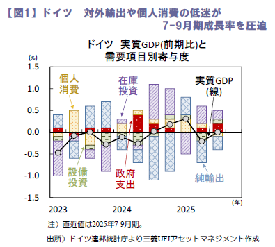 11月25日に公表されたドイツの7-9月期実質GDP(確定値)と需要項目別内訳は、同国経済の弱さを改めて浮き彫りにする結果となりました(図1)。米国による高関税賦課など外部環境の厳しさが続く中、対外輸出は前期比▲0.7%と低迷した他、個人消費も7四半期ぶりに減少に転じ、成長を圧迫。政府支出や投資の増加は景気を下支えしたものの、7‐9月期はゼロ成長に留まりました。